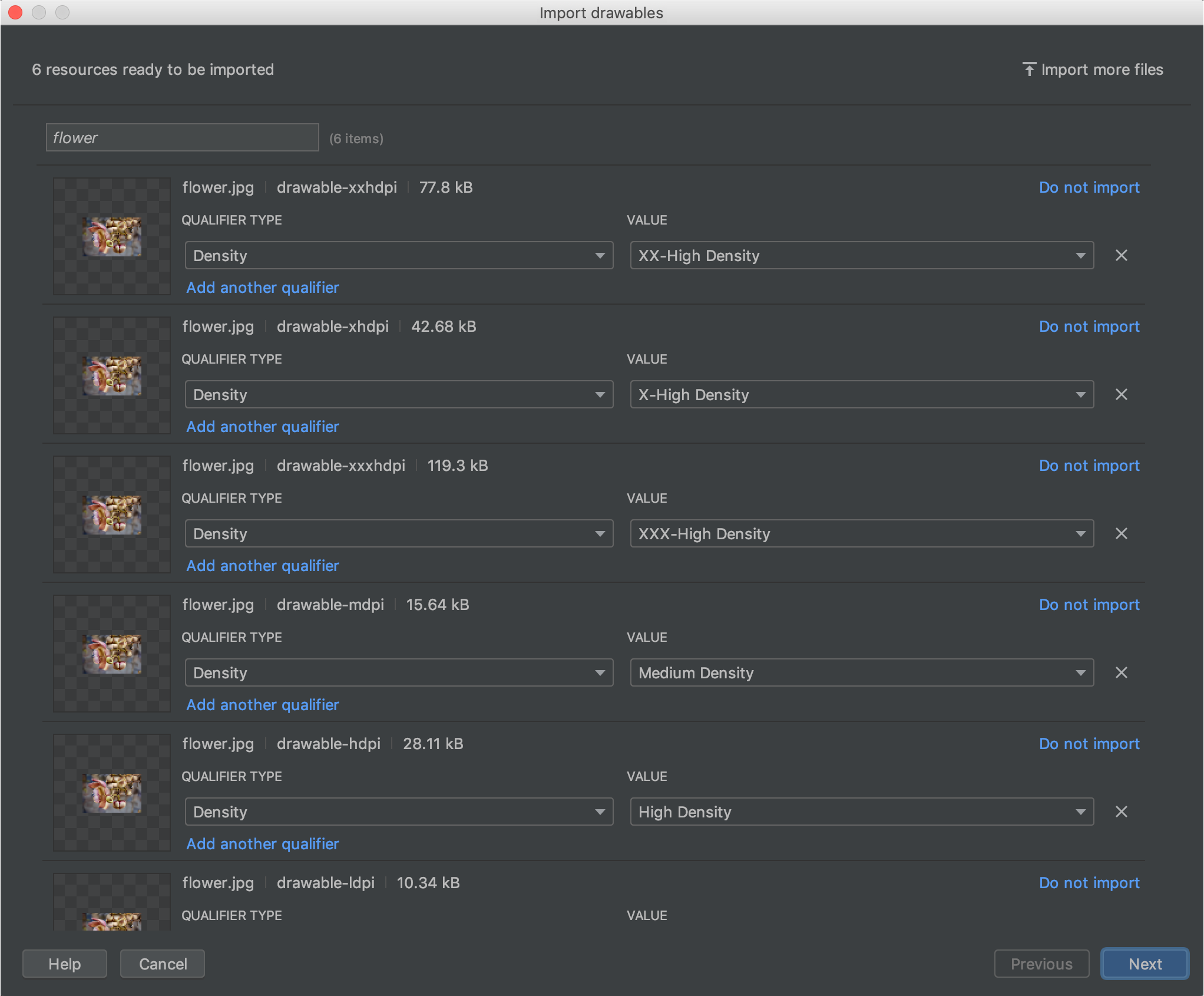 For example, if you're providing multiple versions of the same resource for different screen densities, you can add a Density qualifier for each version. Note that if two or more resources have the same name and qualifiers, only one version is imported.