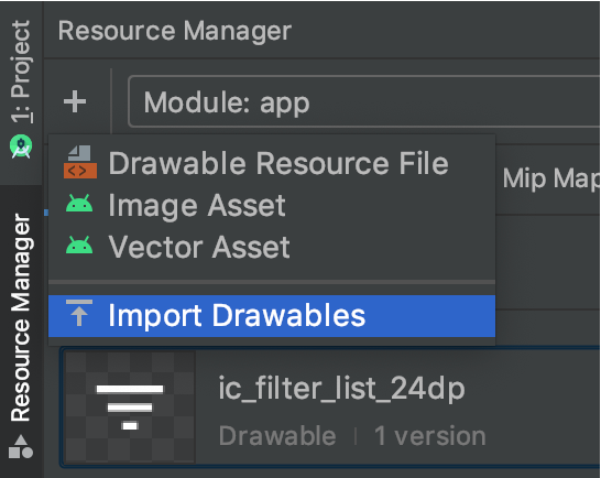 In addition to these features, the Resource Manager provides a way to bulk-import drawables into your project. To bulk-import, you can either: