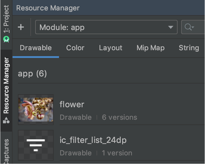 Resource Manager is a tool window for importing, creating, managing, and using resources in your app. To open the tool window, select View > Tool Windows > Resource Manager from the menu or select Resource Manager in the left side bar.