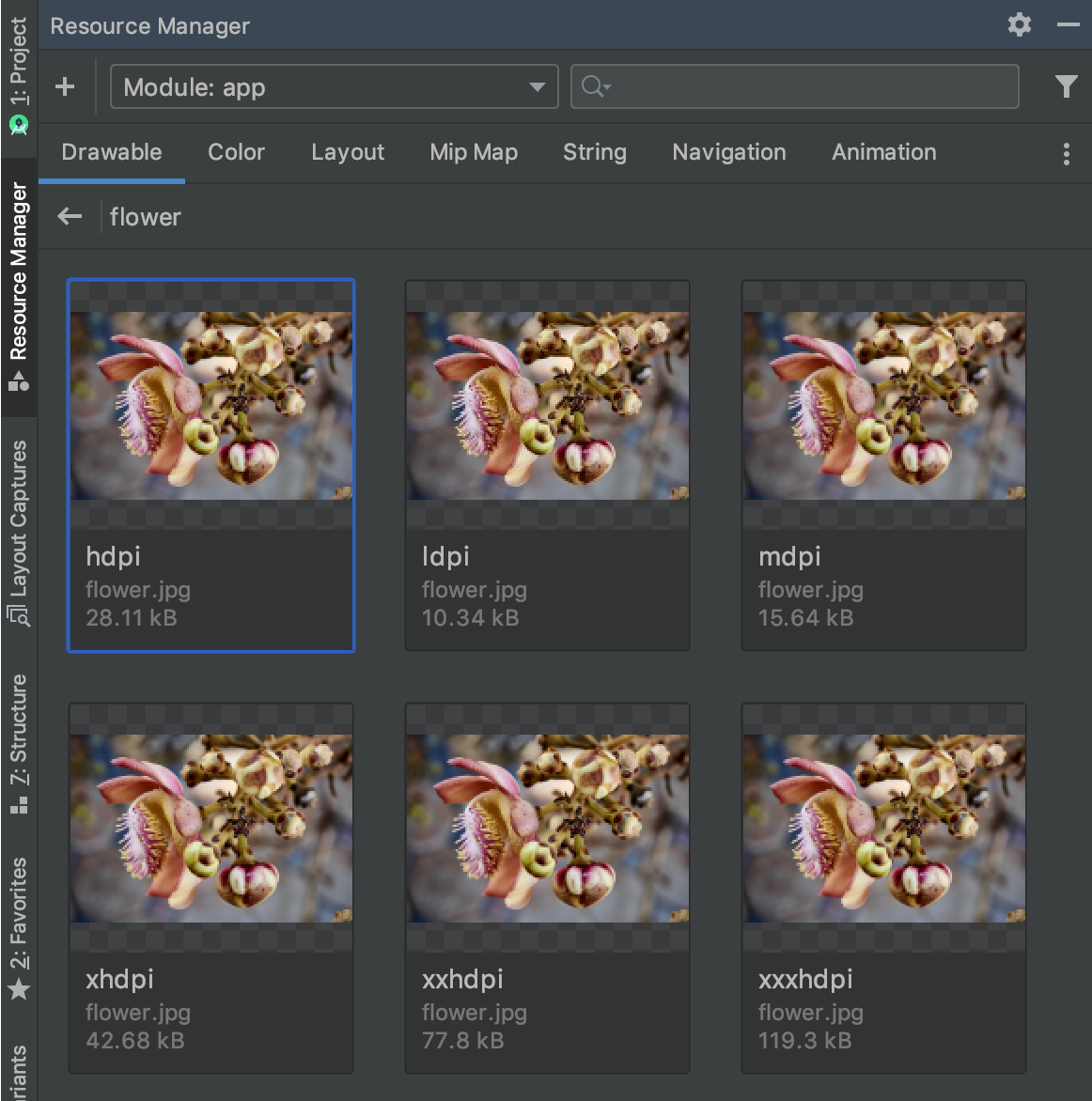 Figure 2. The Resource Manager showing versions of an image resource for different screen densities.