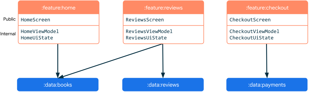 Les fonctionnalités sont associées aux écrans ou aux destinations de votre application. Par conséquent, il est probable qu'elles soient associées à une interface utilisateur et à une ViewModel pour gérer leur logique et leur état. Une fonctionnalité ne doit pas nécessairement être limitée à une seule vue ou destination de navigation. Les modules de fonctionnalités dépendent des modules de données.