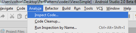 Инструмент Lint в Android Studio может помочь вам почувствовать неэффективность иерархии представлений. Чтобы использовать этот инструмент, выберите «Анализ» > «Проверить код» , как показано на рисунке 1.