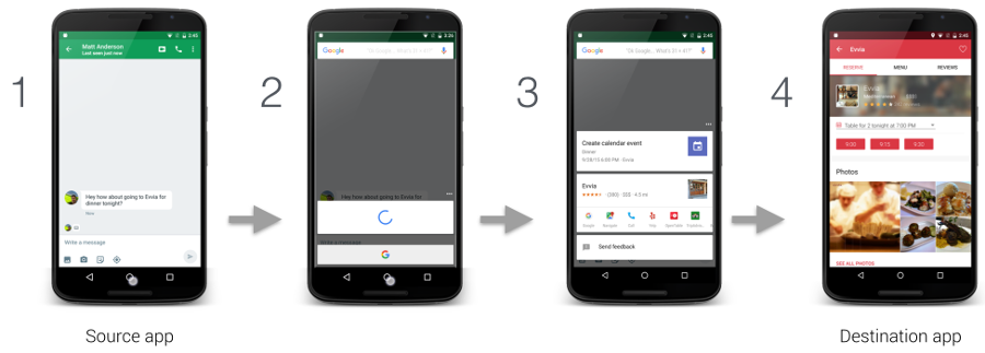 Figure 1 illustrates a typical user interaction with the assistant. When the user long-presses the Home button, the Assist API callbacks are invoked in the source app (step 1). The assistant renders the overlay window (steps 2 and 3), and then the user selects the action to perform. The assistant executes the selected action, such as firing an intent with a deep link to the (destination) restaurant app (step 4).
