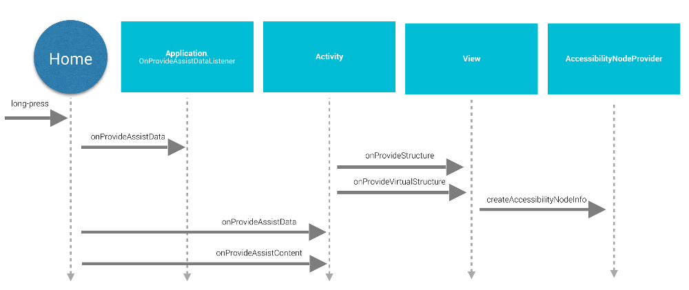 To provide global application context, the app creates an implementation of Application.OnProvideAssistDataListener and registers it using registerOnProvideAssistDataListener(). To provide activity-specific contextual information, the activity overrides onProvideAssistData() and onProvideAssistContent(). The two activity methods are called after the optional global callback is invoked. Because the callbacks execute on the main thread, they should complete promptly. The callbacks are invoked only when the activity is running.