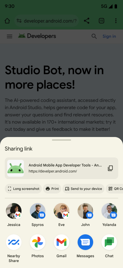 با شروع Android 10 (سطح API 29)، اشتراکگذاری Android پیشنمایشی از متن در حال اشتراکگذاری را نشان میدهد. در برخی موارد، درک متنی که به اشتراک گذاشته می شود دشوار است. به اشتراک گذاری یک URL پیچیده مانند https://www.google.com/search?ei=2rRVXcLkJajM0PEPoLy7oA4