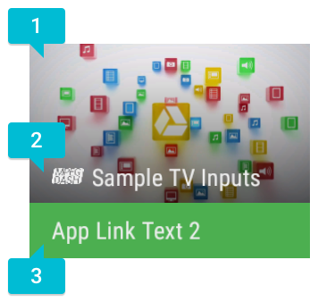 COLUMN_APP_LINK_INTENT_URI)، سیستم از فعالیتACTION_MAINبرای دستهCATEGORY_LEANBACK_LAUNCHERاستفاده میکند که معمولاً در مانیفست برنامه تعریف میشود. اگر این فعالیت تعریف نشده باشد، یک پیوند برنامه غیرفعال ظاهر می شود - اگر کاربر روی آن کلیک کند، هیچ اتفاقی نمی افتد. - برای متن توصیفی (