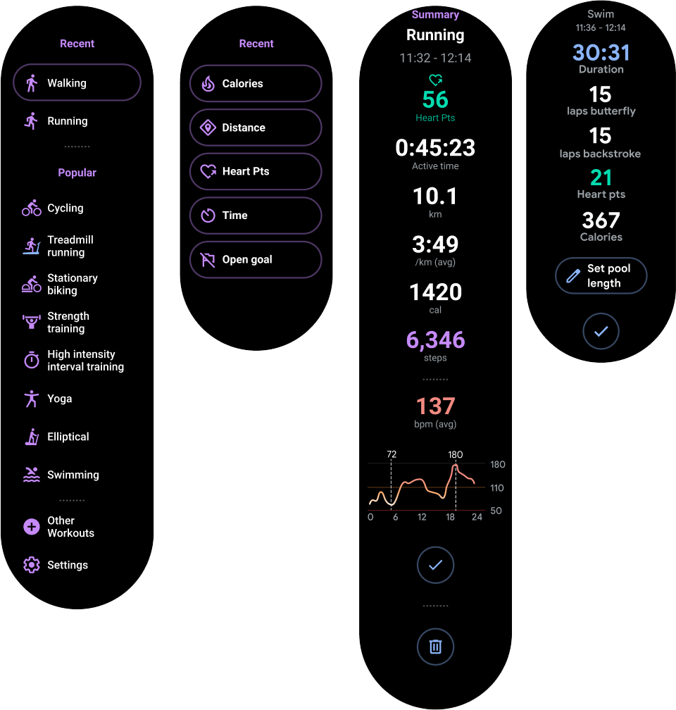 Rysunek 2 przedstawia kilka kompletnych układów aplikacji, w których na okrągłym ekranie zegarka widoczna jest tylko część treści. W tych przykładach główne treści znajdują się w górnej części kontenera, a pozostałe kluczowe ścieżki użytkownika (CUJ) i ustawienia – na dole. Jest to sprawdzona metoda rozmieszczania treści.