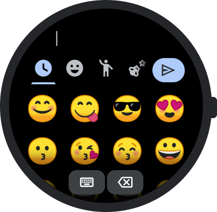 사람들은 다양한 형식으로 소통하는 것을 좋아합니다. Wear OS에서는 이모티콘, 음성, 텍스트와 같은 다양한 입력 메커니즘을 제공하도록 지원합니다.