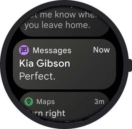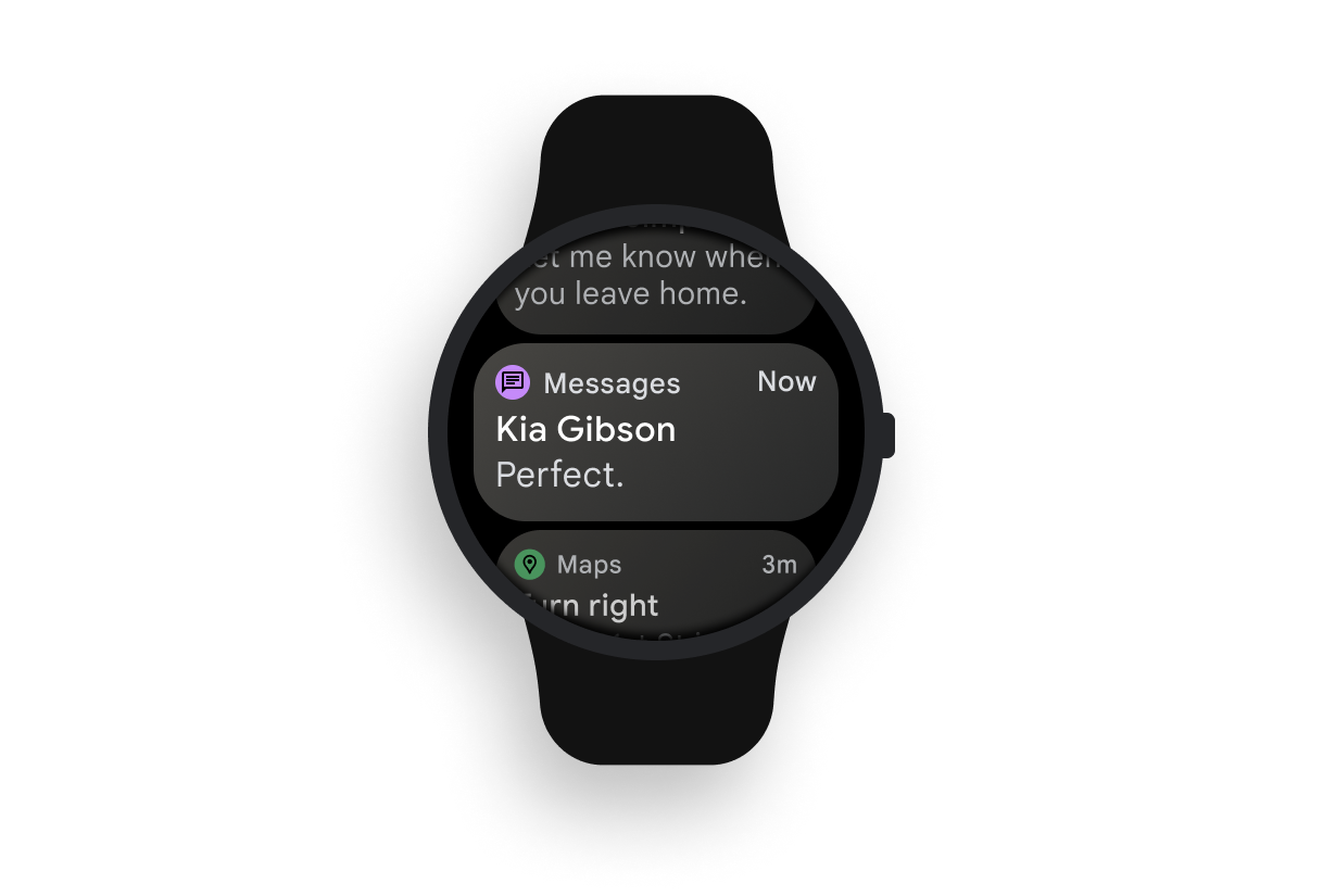 Os modelos de notificação do Wear OS permitem que os apps enviem informações rápidas e fáceis de conferir.