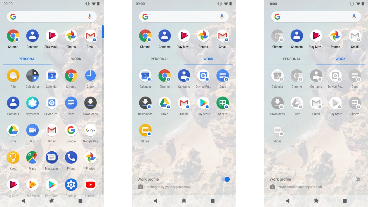 Android 9 (nivel de API 28) incluye cambios en la interfaz de usuario en la configuración selector para ayudar a los usuarios a separar las aplicaciones personales de las de trabajo. Fabricantes de dispositivos que respaldan esto puede presentar a los usuarios en pestañas separadas del trabajo y personales. También facilitamos la activación y desactivación del perfil de trabajo para los usuarios de dispositivos incluido un interruptor en la pestaña de trabajo del selector.